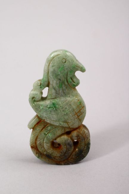 A CHINESE CARVED JADE KNIFE HANDLE OF A PHOENIX BIRD, 6CM.