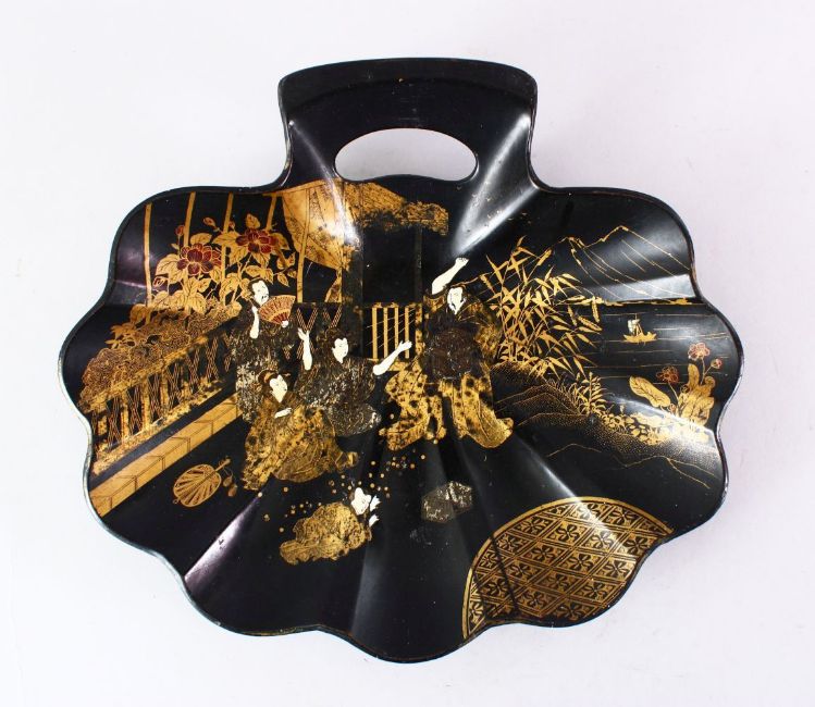 A GOOD JAPANESE MEIJI PERIOD LACQUER FAN SHAPED TRAY, the tray finely decorated with scenes of four immortals in a garden setting, 31cm wide x 27.5cm.