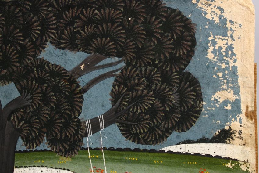 AN INDIAN MUGHAL MINIATURE PAINTING OF FIGURES ON A SWING IN A GARDEN, 30cm x 21cm