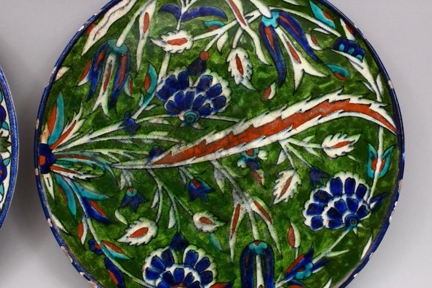 TWO LARGE JERUSALEM PALESTINIAN POTTERY DISHES, Both with formal floral decoration, one af, both approx 26cm.