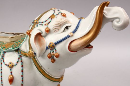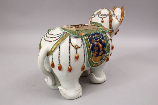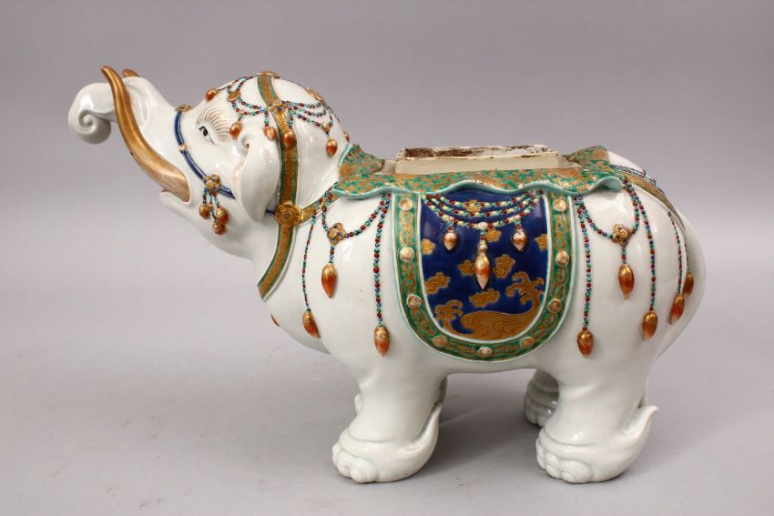 A GOOD JAPANESE MEIJI PERIOD KUTANI PORCELAIN ELEPHANT FIGURE, the figure in a striding pose with kutani decorated wear, 23cm high x 37cm.