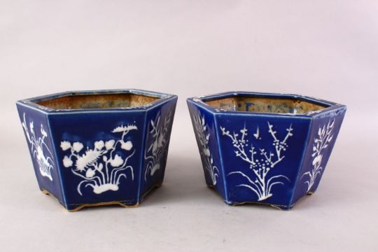 A GOOD PAIR OF 19TH CENTURY CHINESE POWDER BLUE AND CARVED PORCELAIN HEXAGONAL JARDINIERES, both with white carved floral panels and borders, 15.5cm x 23cm.
