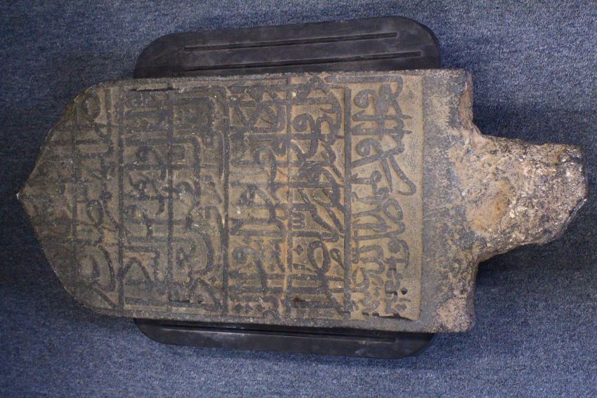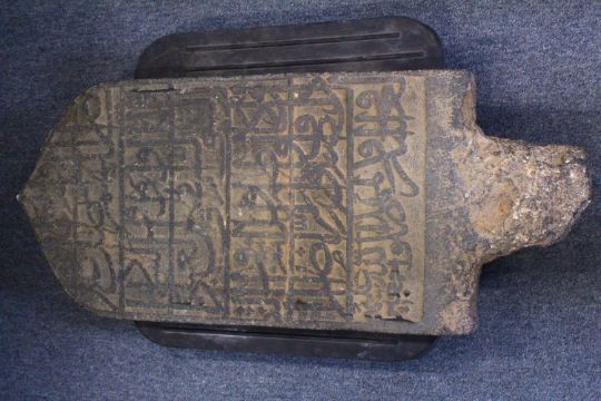 A VERY HEAVY 17TH CENTURY INDIAN DECCANI CARVED CALIGRAPHIC HEADSTONE / PANEL, both sides engraved, 85cm high x 36cm wwide.