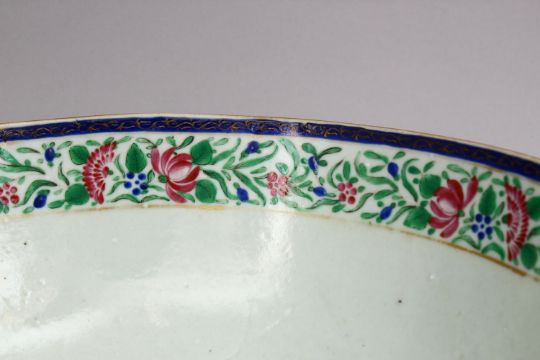 A LARGE 18TH CENTURY CHINESE FAMILLE ROSE PORCELAIN BOWL AND DISH, FOR ISLAMIC MARKET, decorated with simple decoration of flora, with gilt decoration, 28cm & 36cm.