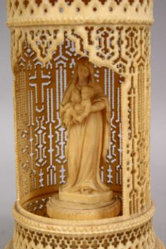 A GOOD 19TH CENTURY ANGLO INDIAN CARVED IVORY SHRINE WITH MADONNA & CHILD, the open work small shrine with crucifix carved decor, the interior with a carved figure of madonna and child, 21.5cm hih.