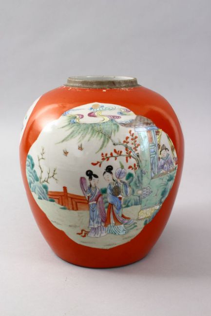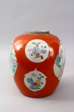 A GOOD CHINESE REPUBLIC PERIOD CORAL GROUND FAMILLE ROSE PORCELAIN JAR, Qianlong style, The body decorated with panels depicting scenes of figures in garden settings amongst buildings, the base with a six character iron red qianlong mark, 24cm high.