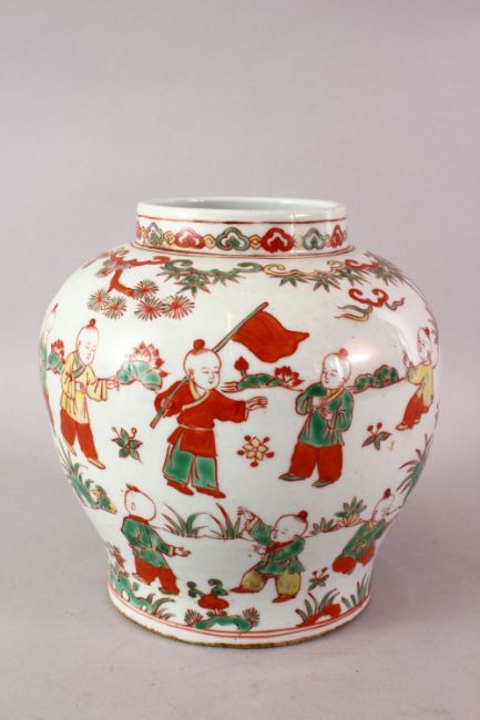 A GOOD 19TH CENTURY CHINESE FAMILLE VERTE PORCELAIN JAR OF BOYS, the body decorated with scens of boys playing on landscape settings, 21.5cm high.