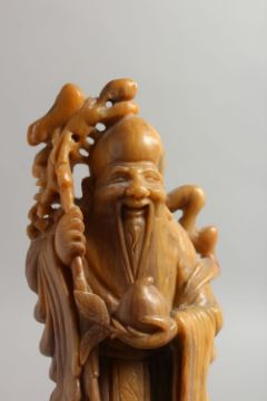 A GOOD 19TH / 20TH CENTURY CHINESE CARVED SOAPSTONE FIGURE OF SHOU LAO, stood on a carved stone base bearing a grin, holding his staff and gourd, 25cm high.