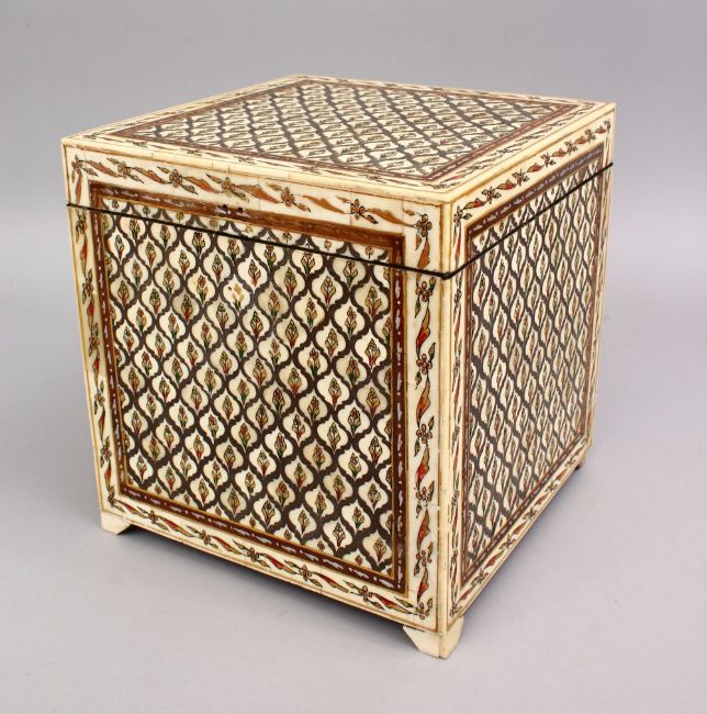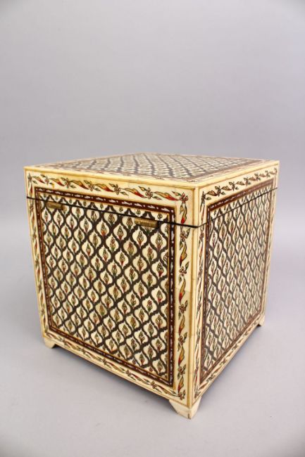 A SUPERB 19TH CENTURY INDIAN IVORY SQUARE BOX, with hinged top, floral design on bracket feet, 9ins.