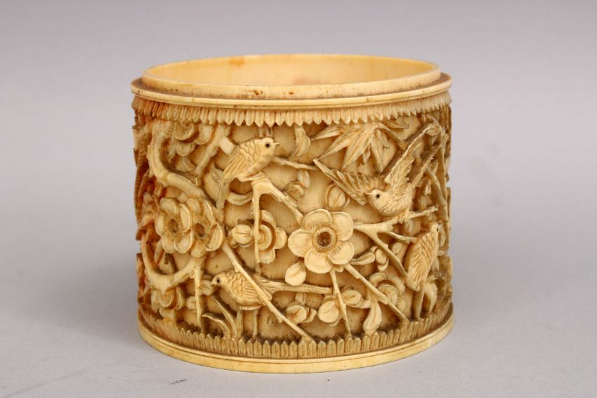 A 19TH CENTURY JAPANESE CARVED IVORY TUSK SECTION, depicting cranes and cherry blossom, 8cm.