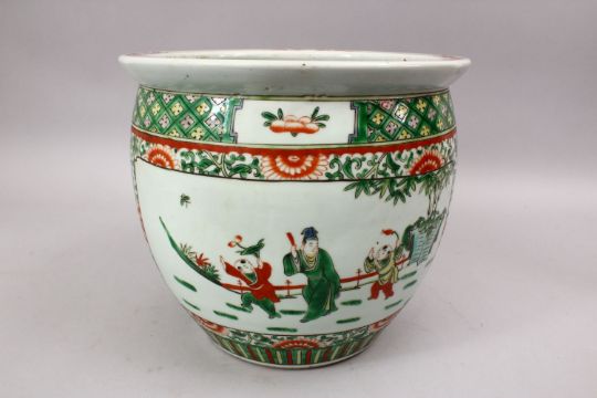 A 19TH CENTURY CHINESE FAMILLE VERTE PORCELAIN JARDINIERE, with panel decoration of figures in landscapes, with floral borders and surrounding decoration, 26cm high x 29cm.