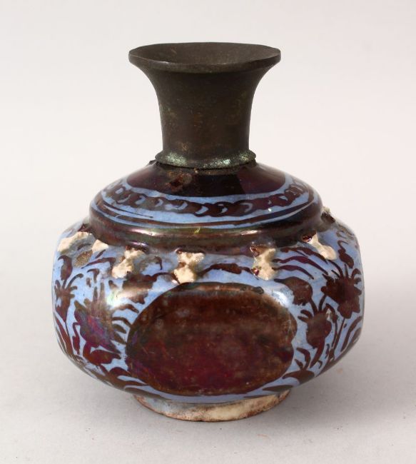 A GOOD 14TH CENTURY PERSIAN LUSTRE POTTERY JAR / VASE, the neck mounted with metal, with a blue ground and floral decoration, 13cm high.