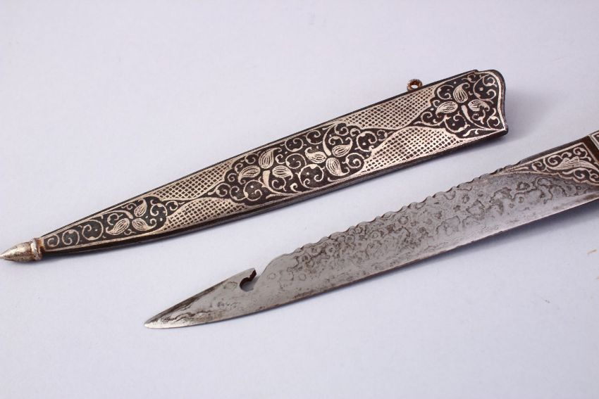 AN EARLY 20TH CENTURY INDIAN IVORY HILTED DAGGER, with silver inlaid Damascus fish hook blade in a niello scabbard, 25cm long.