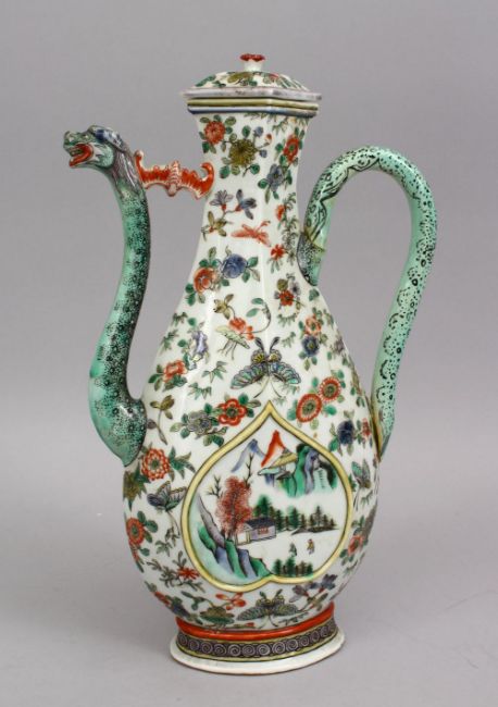 A CHINESE FAMILLE VERTE PORCELAIN EWER, with panel decoration depicting native landscape scenes, further decorated with butterfly and flora, moulded dragon, complete with its cover, (AF), 34cm.