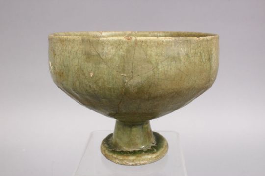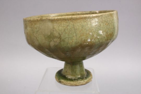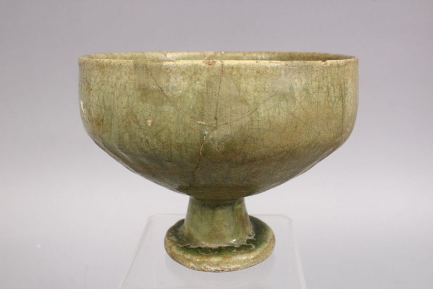 AN EARLY ISLAMIC POSS MAMLUK GREEN CELADON FOOTED POTTERY BOWL. 15cm