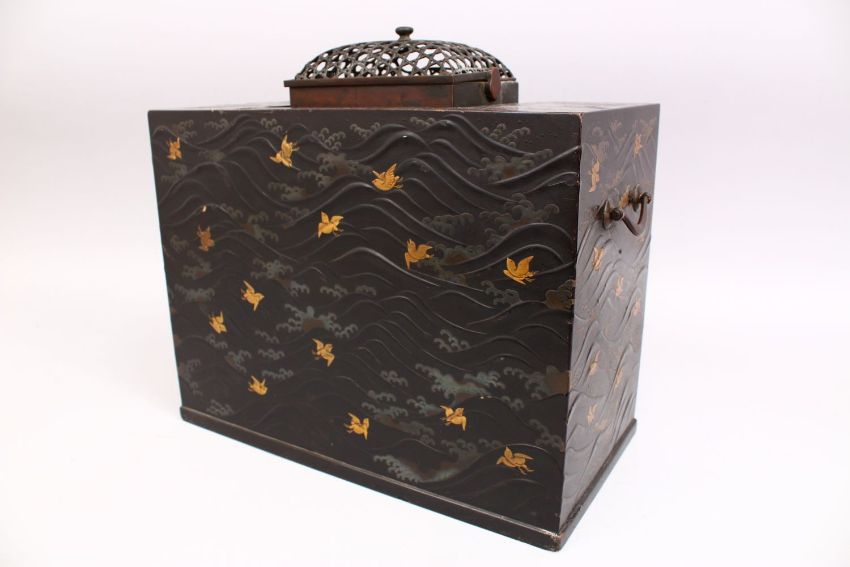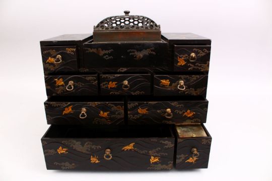 A GOOD JAPANESE MEIJI PERIOD LACQUER CABINET / BOX, The body decorated with raised wave deisgn and gilt birds, the top with koro, with 9 drawers, 34cm x 37cm.