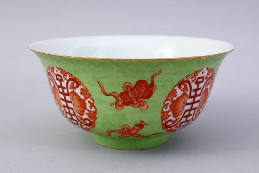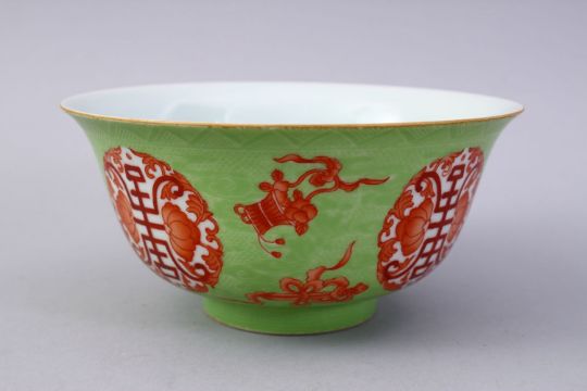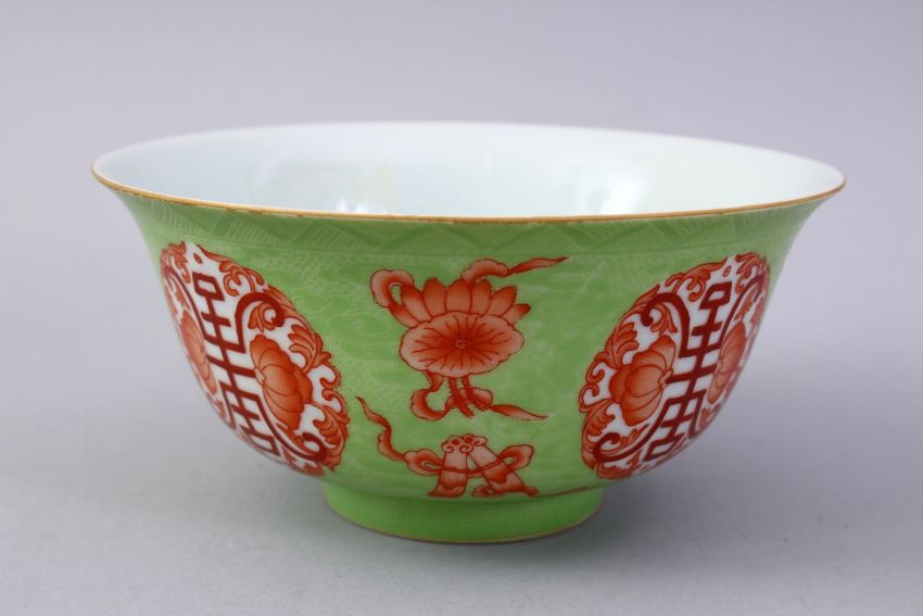 A CHINESE GREEN & IRON RED INCISED DRAGON PORCELAIN BOWL, The bowl with incised dragon decoration with a lime green ground and iron red precious object decoration, the base with a four character yongzheng mark, 15.5cm diameter.