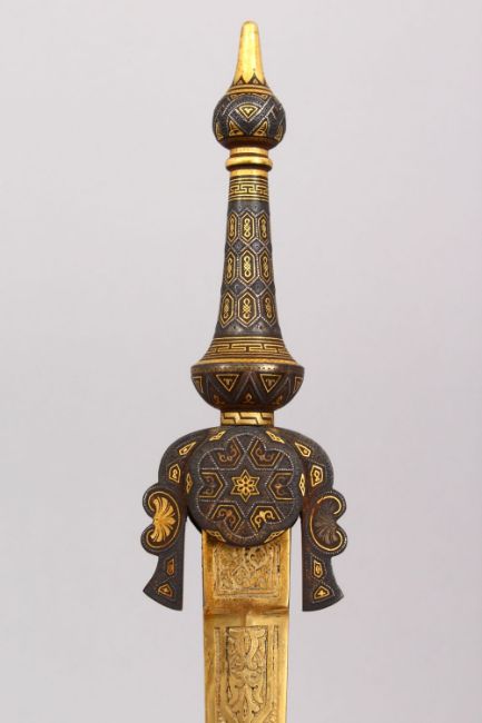 A FINE 19TH / 20TH CENTURY SPANISH HISPANO MORESQUE GOLF INLAID TOLEDO DAGGER, 34cm