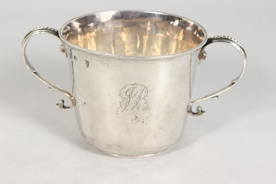 A GEORGE I TWO HANDLED CIRCULAR PORRINGER, open scroll handles with beadwork, engraved A & B on reverse sides. 3.75ins high x 4.5ins diameter.