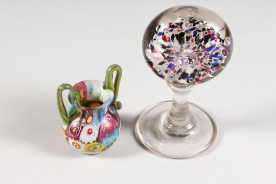 A MINIATURE MILLEFIORI GLASS VASE AND A SMALL WIG STAND (2).