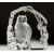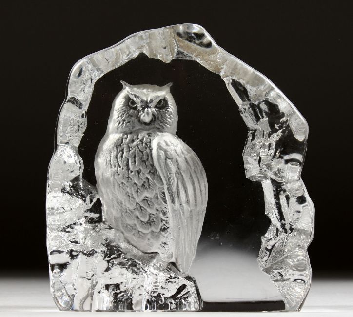 AN INTAGLIO ENGRAVED GLASS ORNAMENT modelled as an owl on a rock, signed.