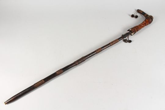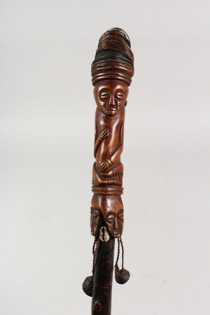 A NATIVE STICK carved with heads and shells. 37ins long.