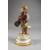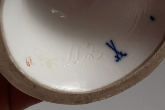 A MEISSEN PORCELAIN FIGURE OF A CHERUB holding a hat and walking with a stick.