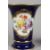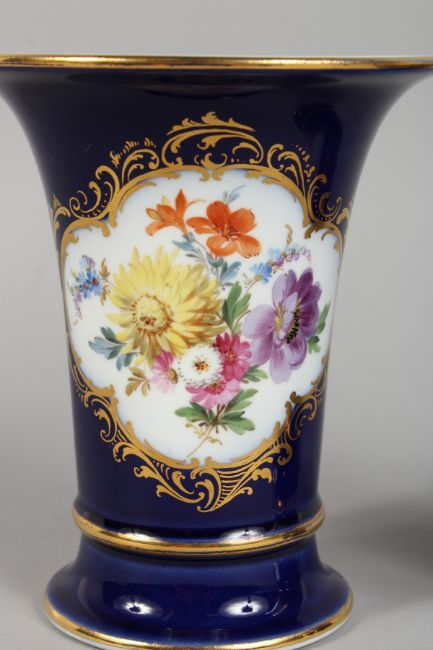 A GOOD PAIR OF MEISSEN PORCELAIN BLUE GROUND TRUMPET VASES, edged in gilt and painted with a panel of flowers.