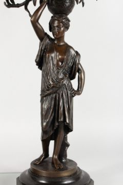CHARLES CUMBERWORTH (1811-1852) A PAIR OF NUBIAN ORIENTALIST BRONZE CANDELABRA, cast as Nubian women holding alft baskets of flowers, standing on octagonal marble bases. 20th Century.