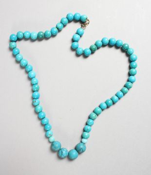 A TURQUOISE BEAD NECKLACE with gold clasp.
