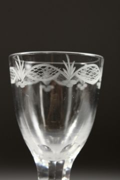 A GEORGIAN WINE GLASS with engraved bowl and cut stem.