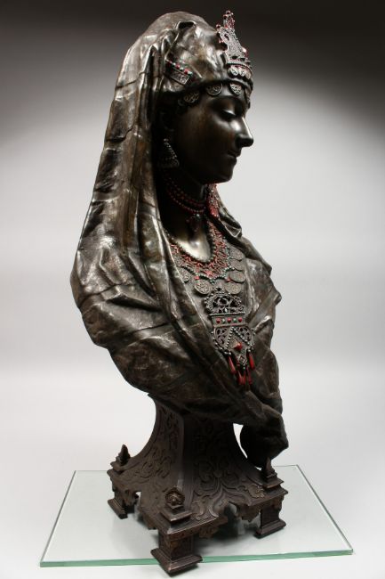 A SUPERB SPELTER BUST OF AN ARAB PRINCESS with head gear, drop earrings and enamel beadwork jewellery, on a square base with bracket feet. 28ins high. Not as catalogue