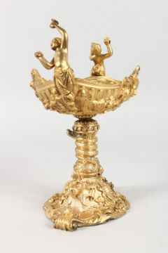 A SMALL GILT BRONZE CENTREPIECE TABLE SALT of classical design with cherub handles.