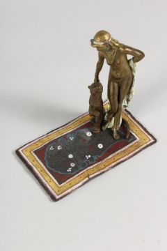 A VIENNA STYLE COLD PAINTED BRONZE OF A LADY AND A LEOPARD STANDING ON A RUG.