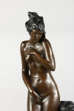 A GOOD LARGE BRONZE GROUP OF AN ARAB SLAVE TRADER SEATED BY A STANDING FEMALE NUDE, on a rouge marble base.