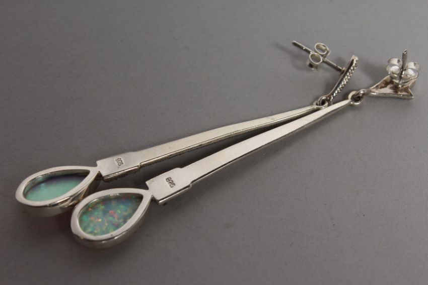 A PAIR OF SILVER, MARCASITE AND OPAL EARRINGS.