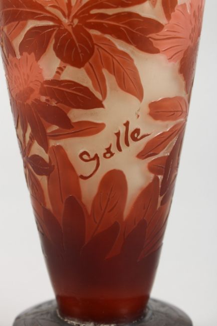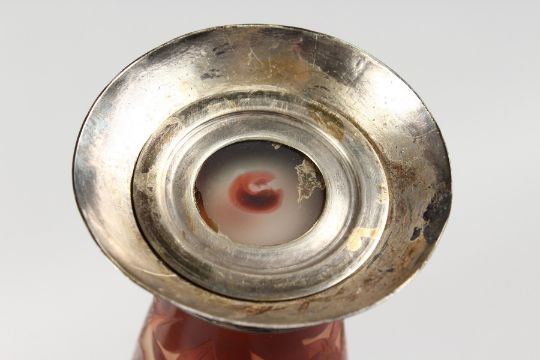 A GALLE GLASS VASE, relief etched with red flowers, on a silver base.