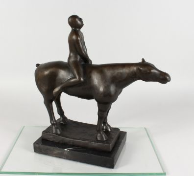 A MINIMALIST STYLE BRONZE GROUP, a naked man on horseback, mounted on a marble base.