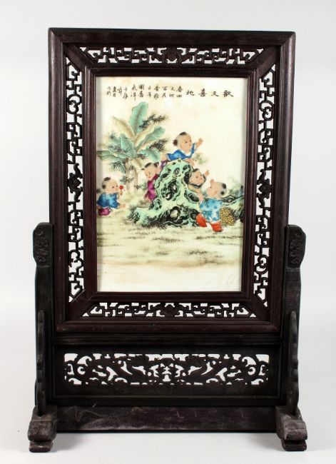 A CHINESE PORCELAIN TABLE SCREEN, in a carved hardwood frame.