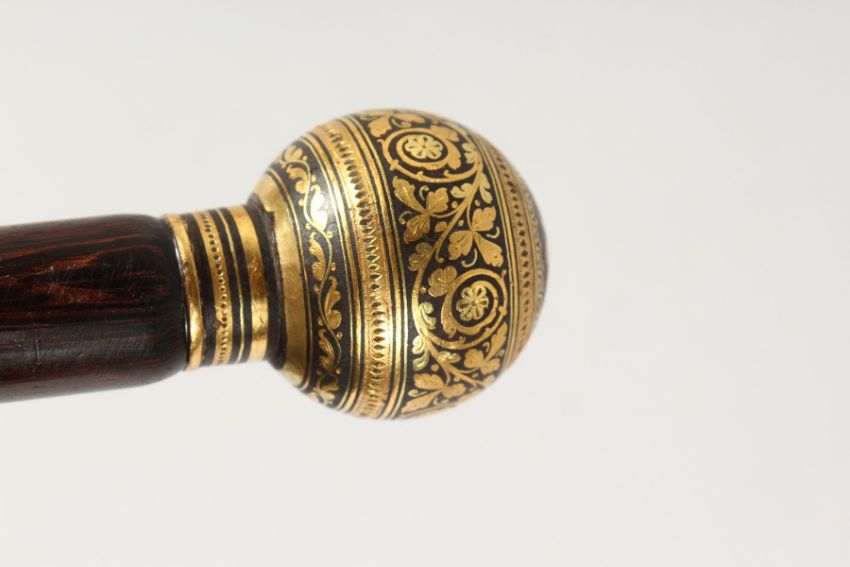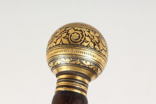 A 19TH CENTURY ROSEWOOD CANE with gold inlaid handle.