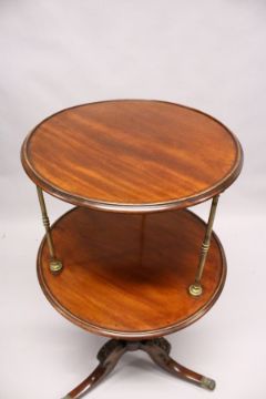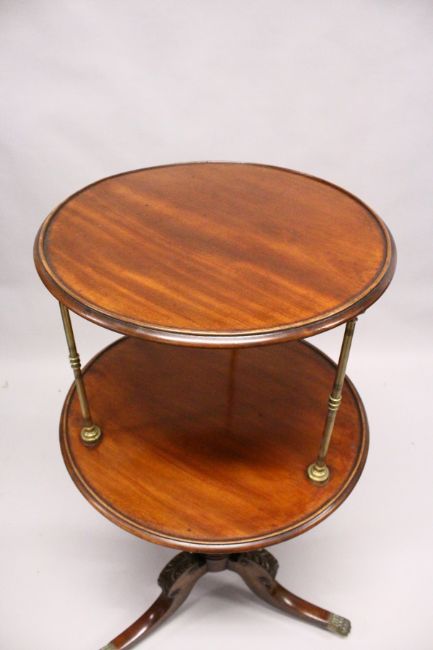 A GOOD REGENCY MAHOGANY CIRCULAR TWO TIER DUMB WAITER with turned brass column supports, the base with a wrythen fluted column, three anthemion carved curving legs with brass caps and castors.