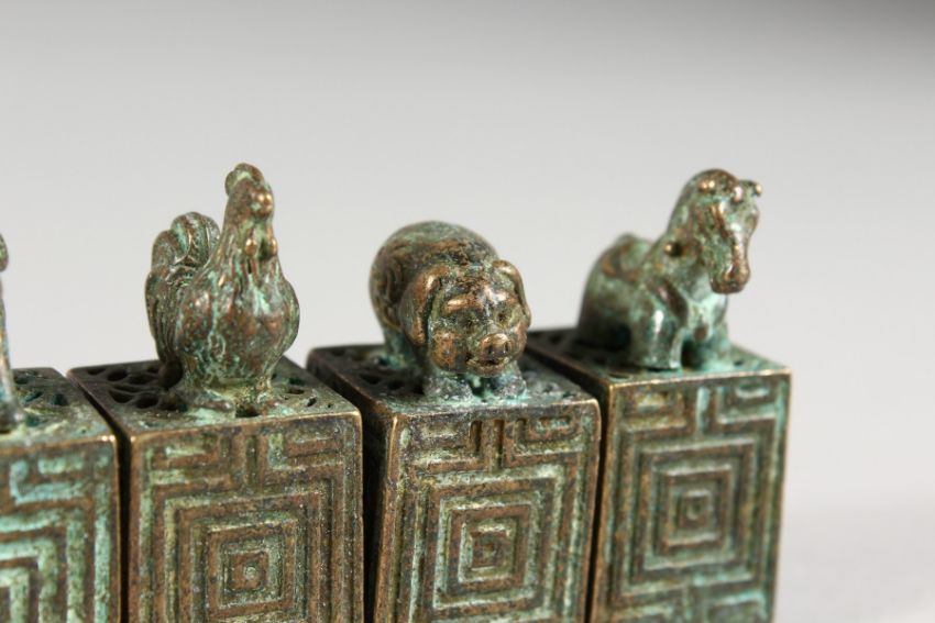 SIX MINIATURE CHINESE BRONZE SEALS / SCROLL WEIGHTS.