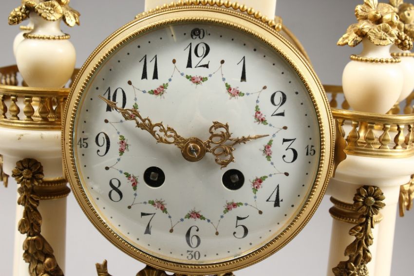 A VERY GOOD LOUIS XVITH WHITE MARBLE AND ORMOLU DRUM SHAPED MANTLE CLOCK with 4.5ins enamel dial, eight day movement and and pillar support.