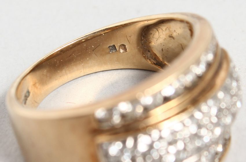 A 9CT YELLOW GOLD DIAMOND TRIPLE ROW RING.