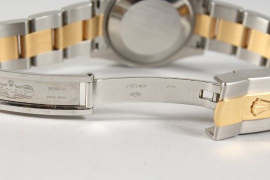 A LADIES' ROLEX STEEL AND GOLD OYSTER PERPETUAL WRISTWATCH in original box.