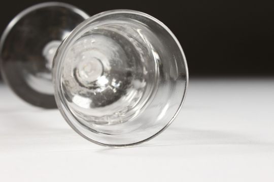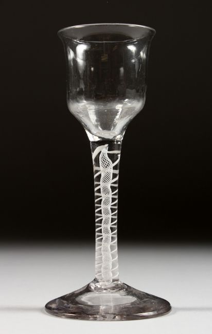 A GEORGIAN WINE GLASS with semi fluted bowl and white twist stem.