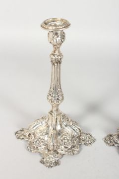 A PAIR OF CONTINENTAL SILVER CANDLESTICKS repousse with scrolls and shells.