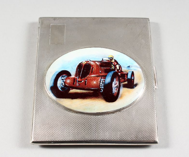 AN ENGINE TURNED SILVER CIGARETTE CASE, with an oval enamel of a vintage racing car.