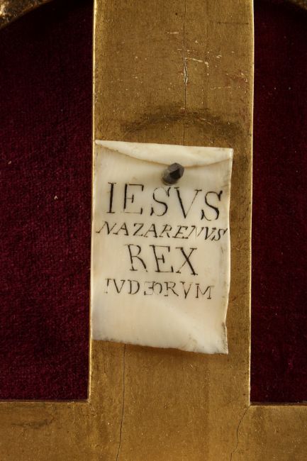 A SUPERB QUALITY EARLY 19TH CENTURY ITALIAN CARVED IVORY CORPUS CHRISTI in an arched gilt frame with red velvet background.