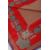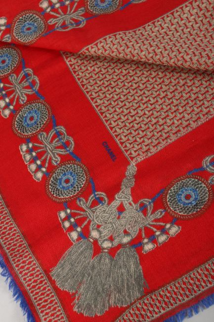 A VINTAGE CHANEL SILK SCARF, RED AND BLUE WITH TASSELS.